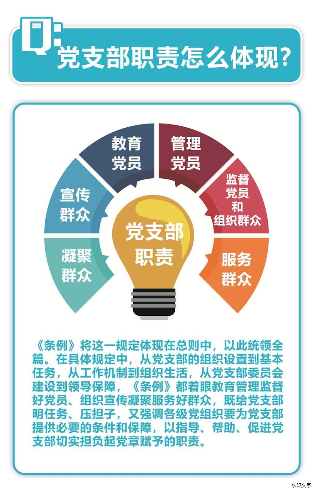第二條 黨支部是黨的基礎(chǔ)組織,是黨組織開展工作的基本單元,是黨在社會基層組織中的戰(zhàn)斗堡壘,是黨的全部工作和戰(zhàn)斗力的基礎(chǔ),擔(dān)負(fù)直接教育黨員、管理黨員、監(jiān)督黨員和組織群眾、宣傳群眾、凝聚群眾、服務(wù)群眾的職責(zé)。