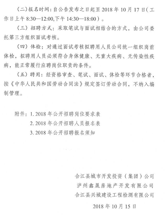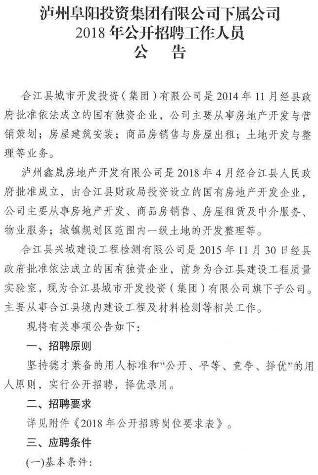 招聘公告:瀘州阜陽投資集團有限公司下屬公司2018年公開招聘工作人員公告