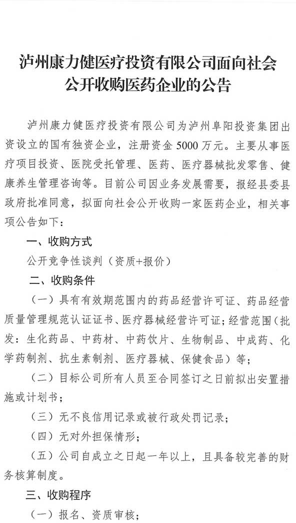 收購公告:瀘州康力健醫(yī)療投資有限公司面向社會公開收購醫(yī)藥企業(yè)的公告