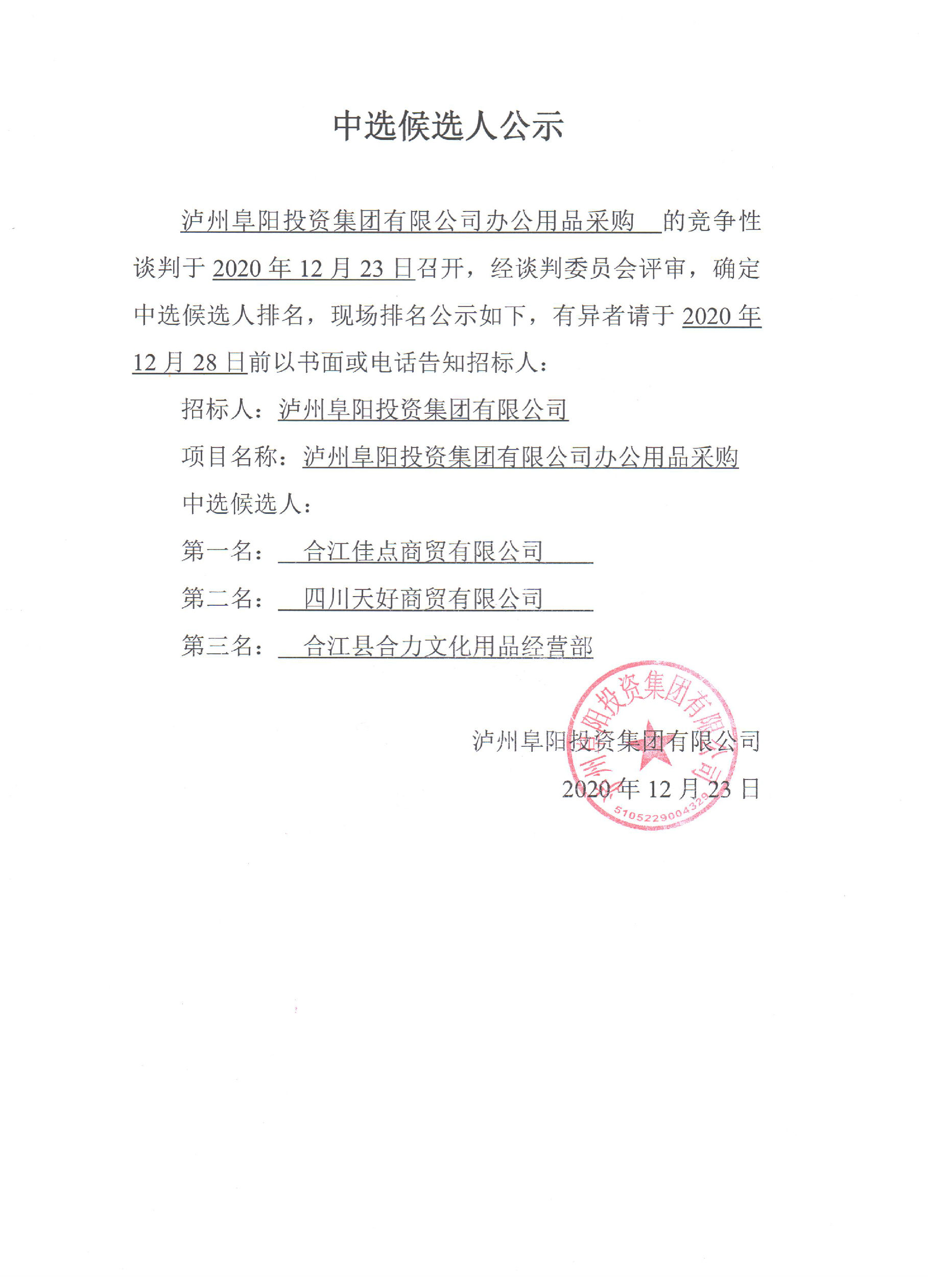 瀘州阜陽投資集團有限公司辦公用品采購中選候選人公示