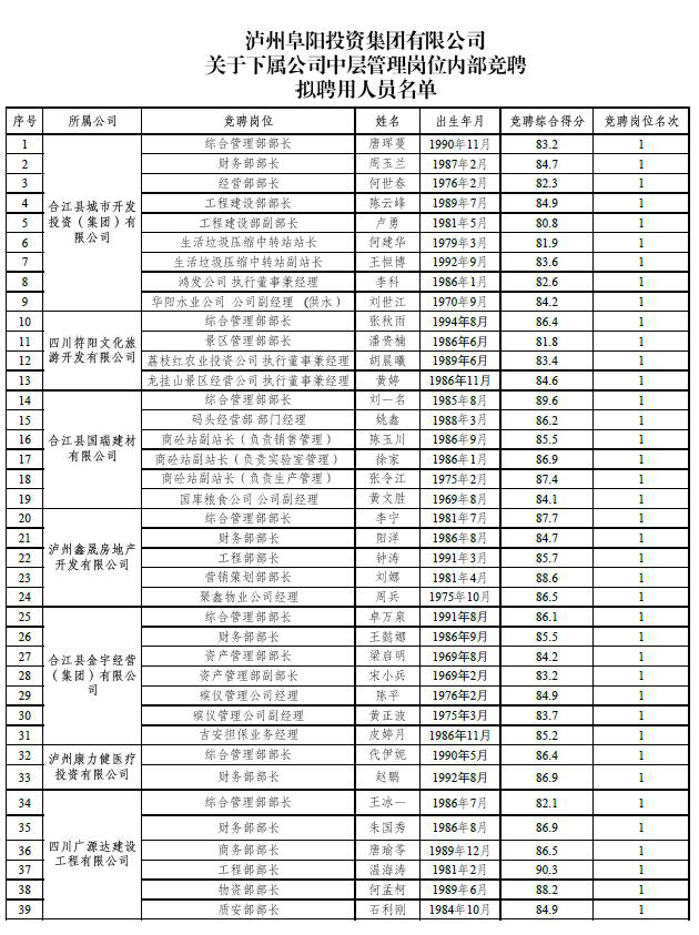 根據(jù)《瀘州阜陽投資集團(tuán)有限公司關(guān)于下屬公司中層管理崗位內(nèi)部競(jìng)聘工作的公告》(瀘阜投發(fā)〔2020〕21號(hào))的規(guī)定,經(jīng)阜陽集團(tuán)黨委會(huì)研究決定,擬聘用唐琿蔓等39人為瀘州阜陽投資集團(tuán)有限公司下屬公司中層管理人員?,F(xiàn)面向社會(huì)公示7日,公示時(shí)間2020年6月19日至2020年6月25日。公示期間,如有問題,請(qǐng)及時(shí)向?yàn)o州阜陽投資集團(tuán)有限公司組織與人力資源管理部反映。要求舉報(bào)者署實(shí)名,實(shí)事求是地反映問題,并提供必要的調(diào)查線索。