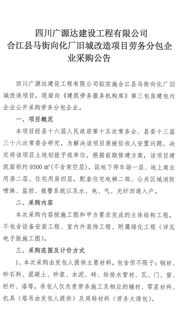四川廣源達(dá)建設(shè)工程有限公司 合江縣馬街向化廠舊城改造項(xiàng)目勞務(wù)分包企業(yè)采購(gòu)公告.doc